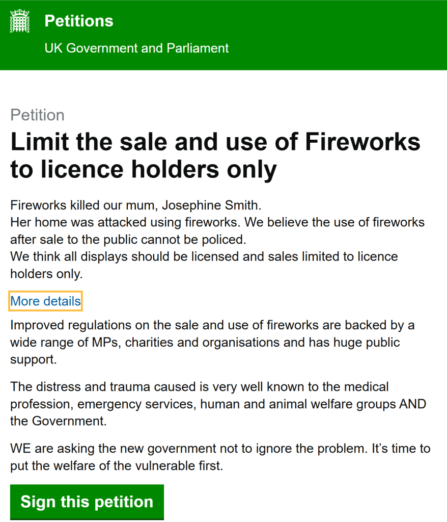 Julie delivered the Firework Campaign’s petition for legislation reform with over 1,086,000 signatures to 10 Downing Street yesterday (05/11/2024) accompanied by representatives from Assistance Dogs UK, British Horse Association, Dogs Trust, Redwings and RSPCA and Alex Mayer MP.