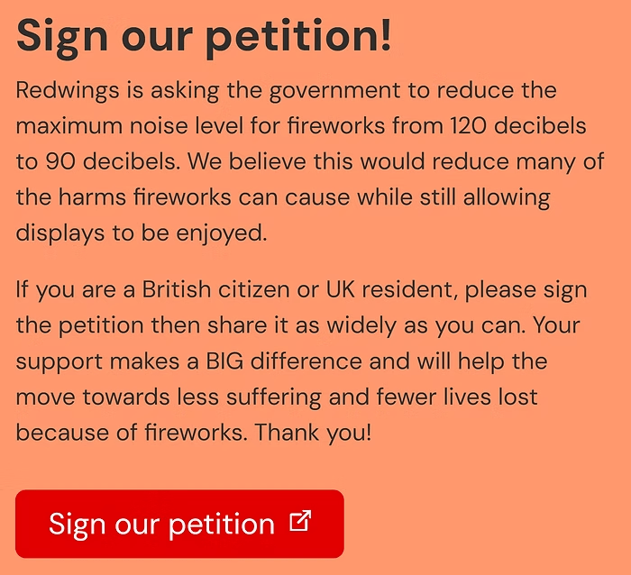 Redwings Horse Sanctuary have started a petition asking the government to reduce the maximum noise level for fireworks from 120 decibels to 90 decibels. Please sign and share the petition