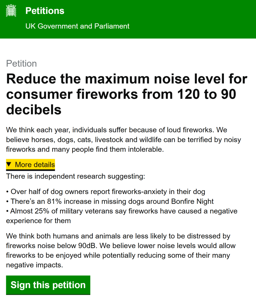 - Working alongside animal, armed forced and mental health charities to spread the word about our campaign to limit the sale of the loudest fireworks.