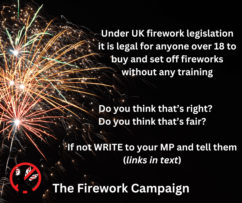 Scotland leads the way on firework legislation proving that things can change and persistence pays off. This is happening because MPs listened when their constituents contacted them. This can happen in the rest of the UK but your MP needs to hear from you. It’s easy using https://www.writetothem.com. Just tell them your experiences – if you don’t tell them they won’t know