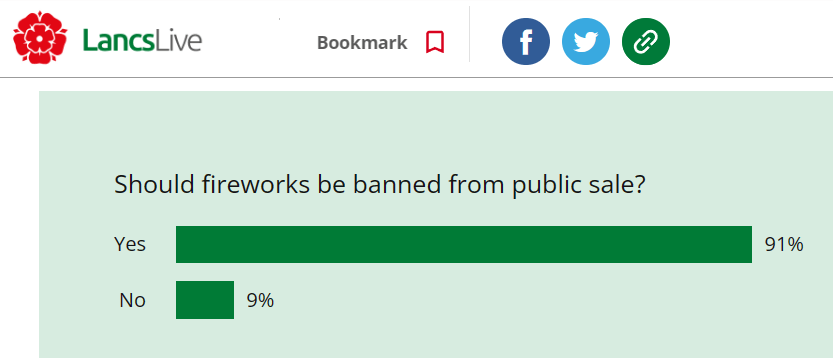 We’ve looked into polls around the country and what the people want. On average, around 85% of us want a ban on sales of fireworks to the public. And have been saying so for at least 20 years! And many charities are also calling for it.