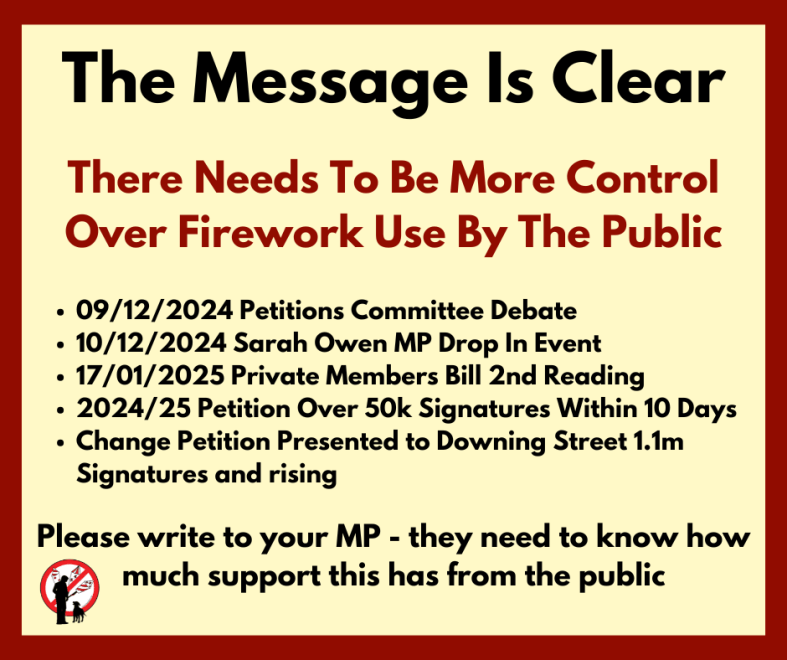 – Ask them to attend Sarah Owen’s MP drop-in event on 10th December, where MPs can learn more about her private members’ bill on firework reform and the widespread public support for these changes.