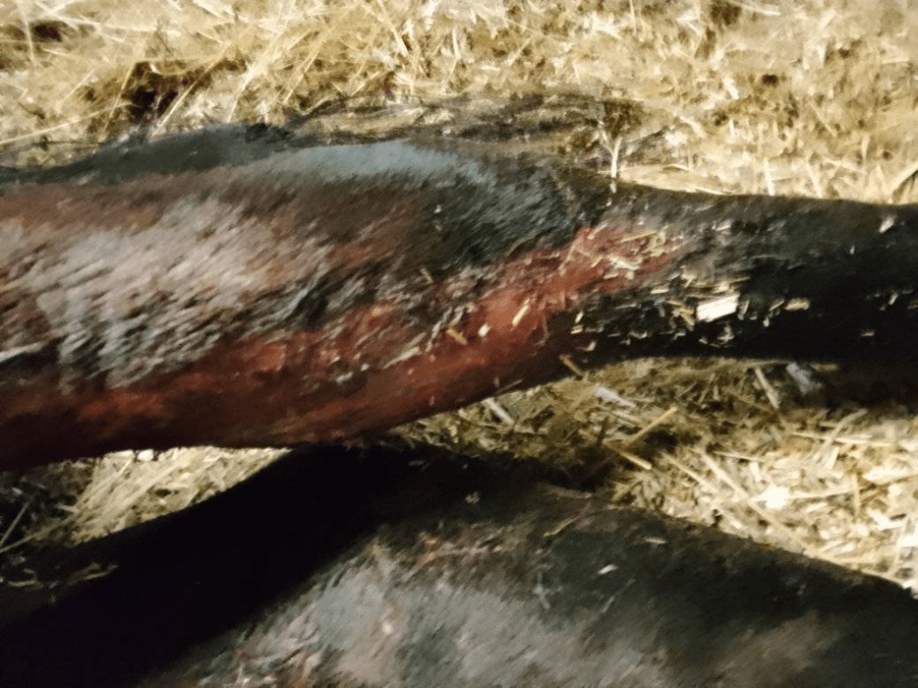 Unfortunately when the vet came the next day, it was worse than we thought. After cutting away the necrotic skin there seemed to be a hole. The skin was also starting to peel away on the front of his fetlock.